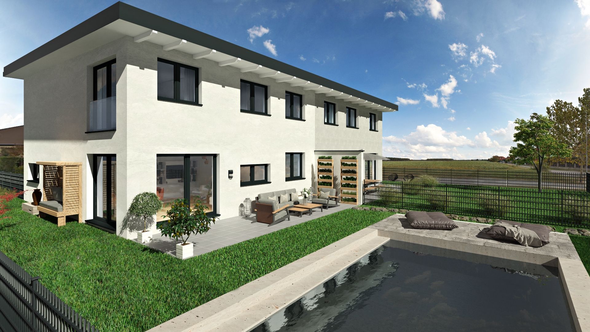 Das Haus ist mit Elektro- Wasser- und Abwasserinstallationen ausgestattet, es wird je nach gewähltem Ausstattungs-Paket teilweise oder gänzlich möbliert geliefert.