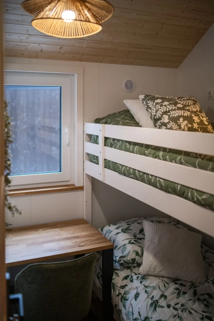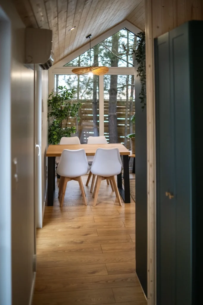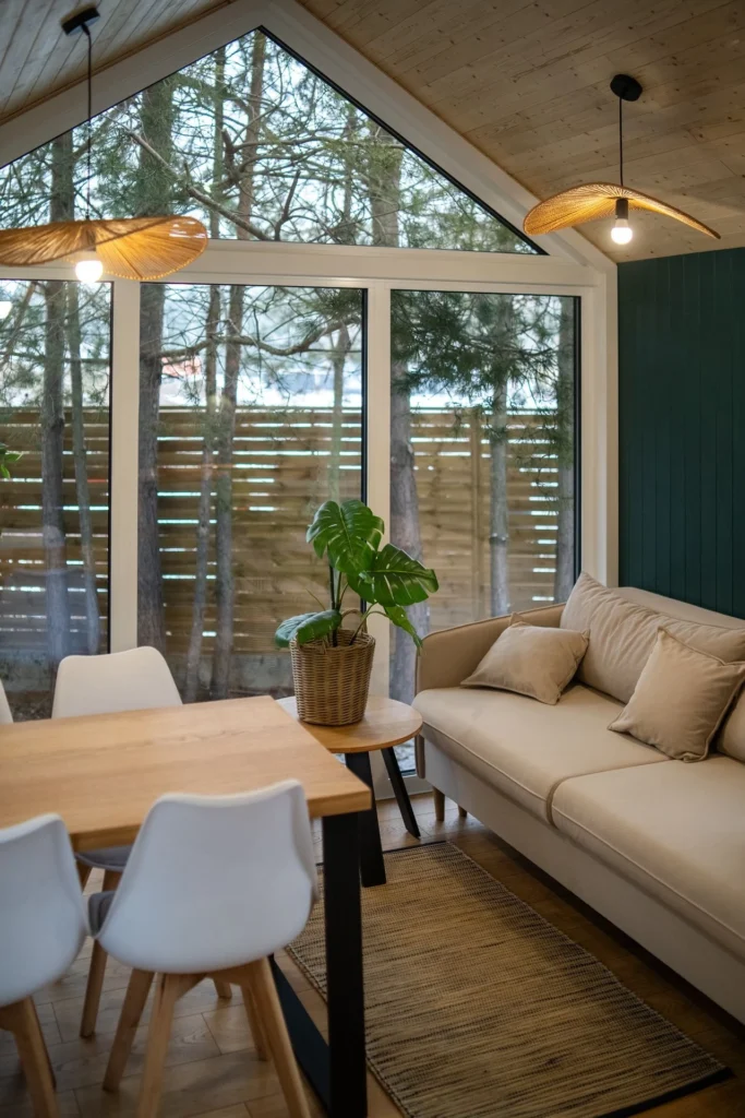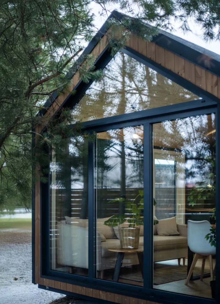 Die Außenfassade besteht aus einer Kombination von Holz und Aluminium. Innen wird Fichtenholz verwendet, der Boden ist mit Laminat versehen.