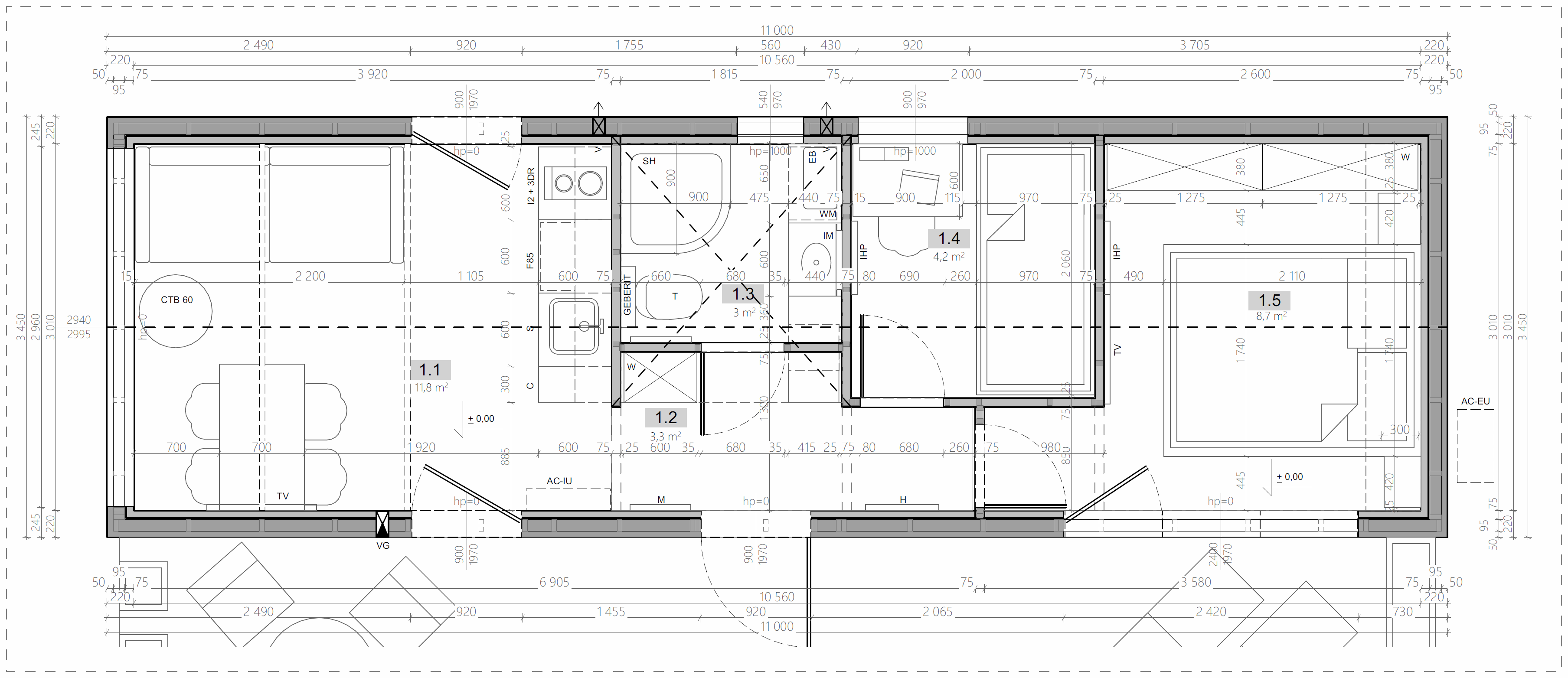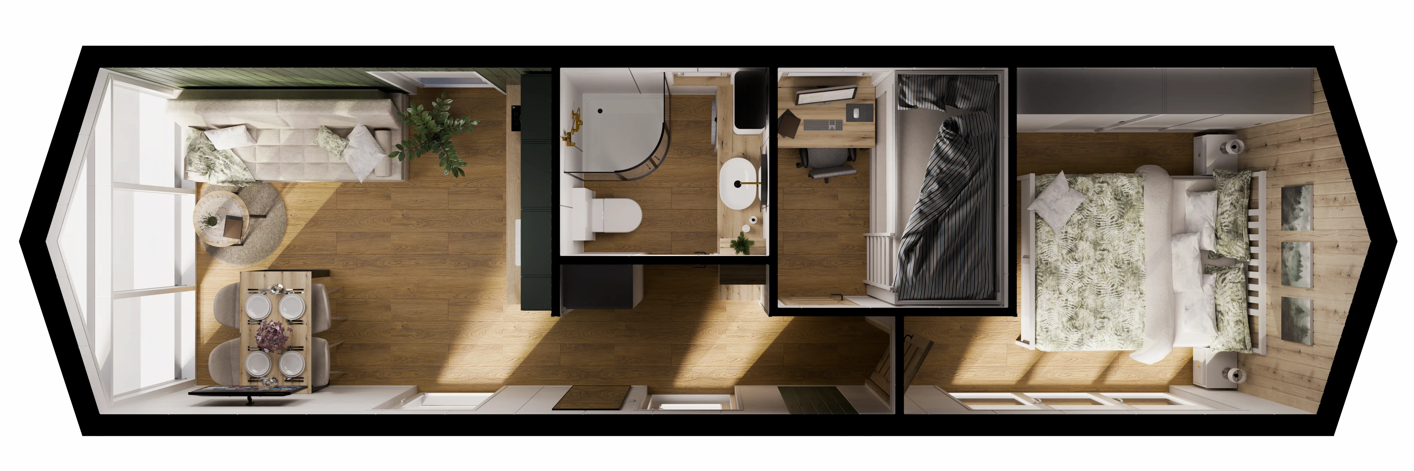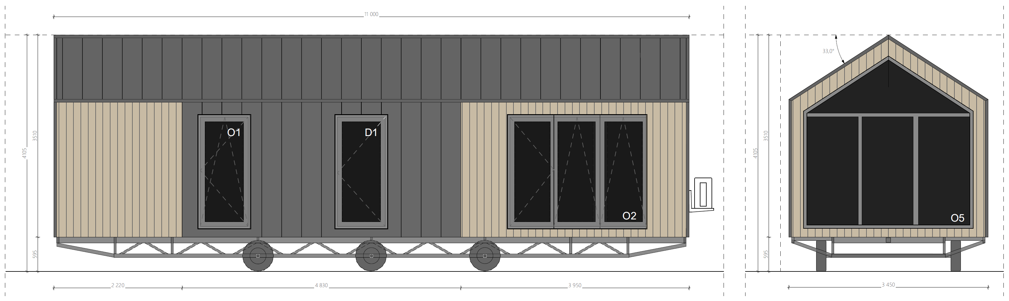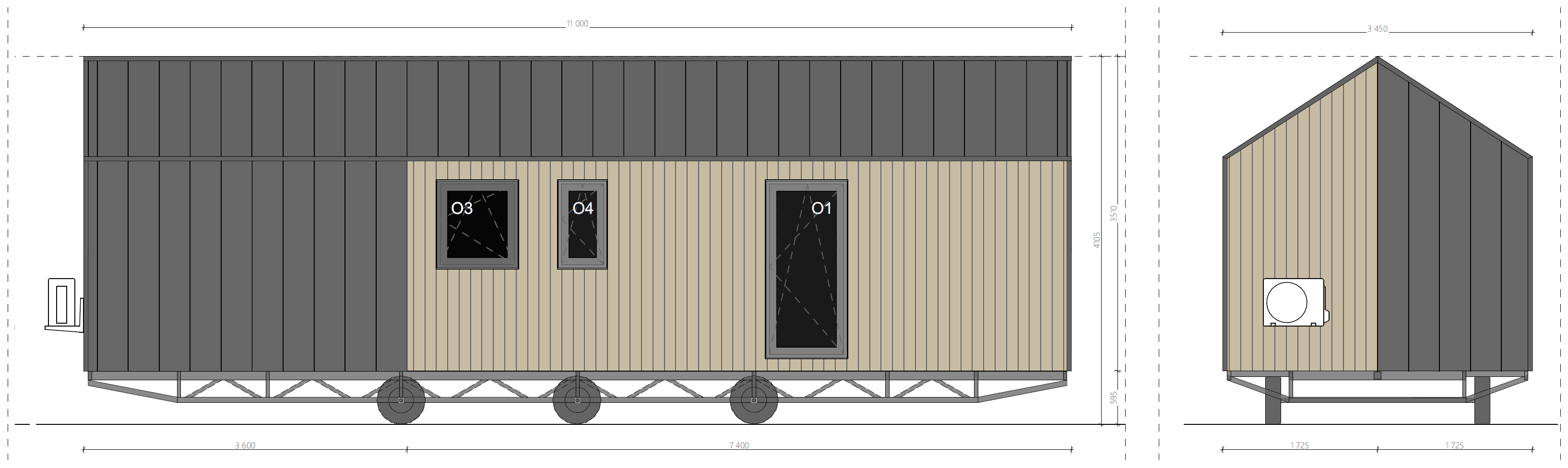 Das Tiny House A31 misst 11 m in der Länge, 3,45 m in der Breite und 4 m in der Höhe.